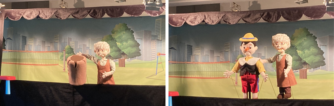 | 공연내용 | 제페토 할아버지는 어느날 사람처럼 말도 하고 장난치는 나무토막을 발견하고는 인형을 만들기로 한다. 그렇게 탄생한 피노키오는 개구쟁이다. 집안 여기저기 다니면서 넘어지기 일쑤고 구슬을 집어삼켜 목에 걸리기도 한다, 그럴 때 마다 피노키오의 코가 길어진다. 할아버지는 그냥 두고 볼 수 없어 피노키오를 어린이집에 보내기로 한다. 피노키오는 친구들과 선생님을 통해 생활 속 안전에 대해 공부하게 되고, 낯선 사람을 함부러 따라가면 안 된다는 걸 배웠다. 장난꾸러기 피노키오가 친구 아람이와 함께 놀이터에서 공놀이를 하다 멀리 날아간 공을 찾으러 간 사이, 아람이는 아빠친구라는 낯선 사람을 따라 가버렸다. 선생님께 이 사실을 알리고 피노키오는 직접 친구 아람이를 찾아 나선다. 다행히 멀리가지 않은 아람이와 낯선 사람을 발견한 피노키오는 용감하게 큰소리로 아람이를 괴롭히지 말라고 소리친다. 낯선 사람은 황급히 도망가고 아람이는 무사히 피노키오와 어린이집으로 돌아왔다. 친구를 위해 좋은 일을 한 피노키오의 코가 짧아지고, 앞으로 생활 속 안전수칙을 잘 지키겠다고 피노키오는 친구들과 함께 약속한다. |